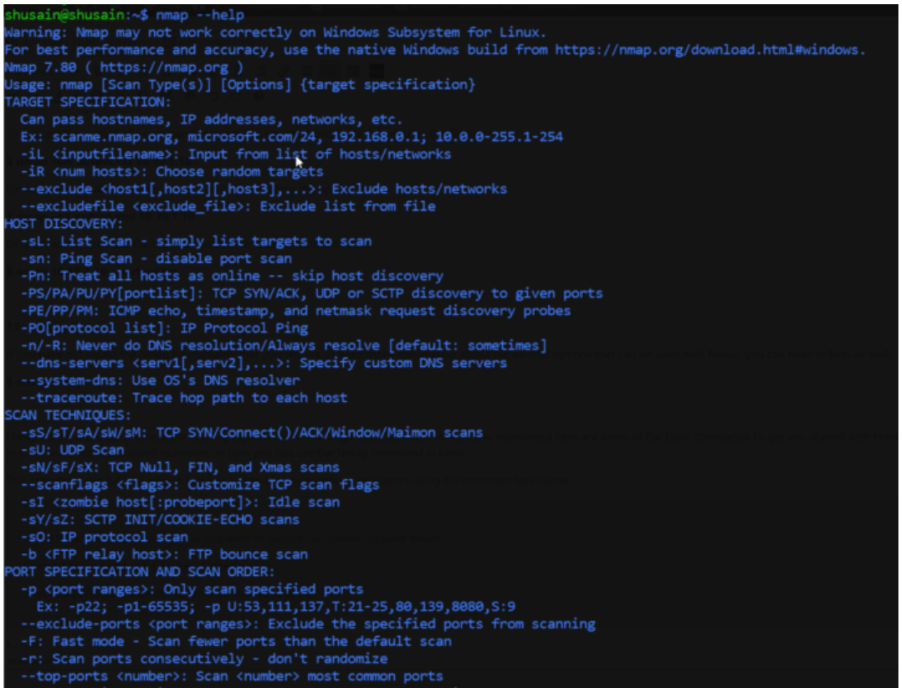如果您没有找到所需的nmap功能,或者需要有关Nmap可以使用的各种选项的更多信息,则也可以参考帮助,