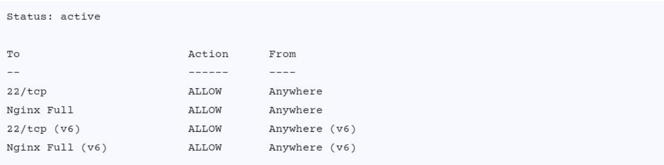 要使用Nginx,您需要打开HTTP端口(80)和HTTPS端口(443)。您可以通过在UFW上启用“ Nginx Full”配置文件来打开HTTP和HTTPS端口:
