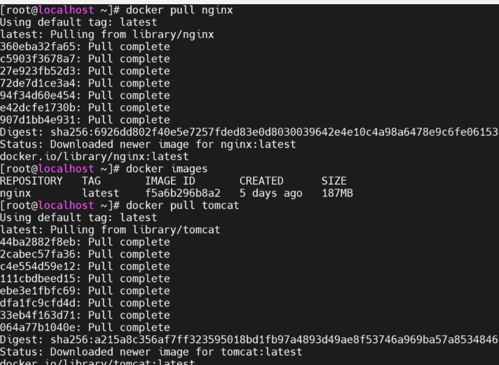 来测试一下新的仓库源,我们来拉取nginx和tomcat的镜像。