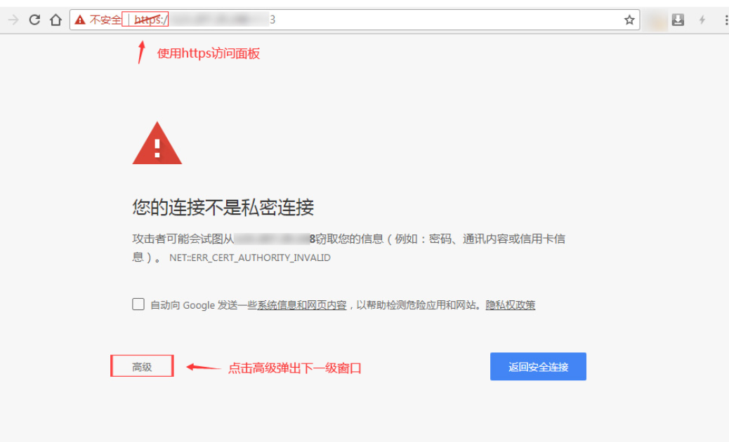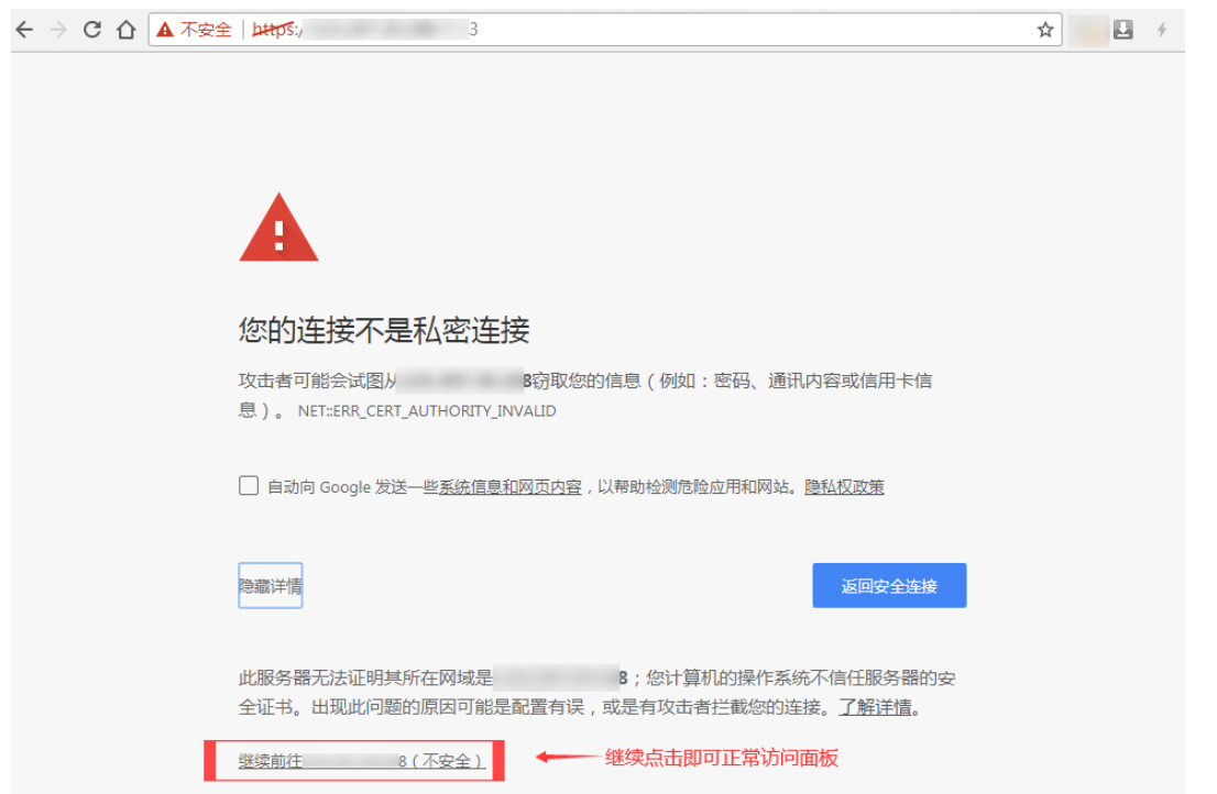 以下为chrome/firefox/edge为案例,跳过安全警告进行访问面板,如是其他浏览器亦可参考此步骤,