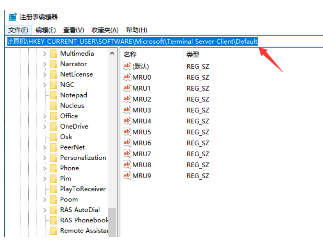 2. 选中注册表编辑器路径 -> 路径为 '计算机\HKEY_CURRENT_USER\SOFTWARE\Microsoft\Terminal Server Client\Default’-> 回车