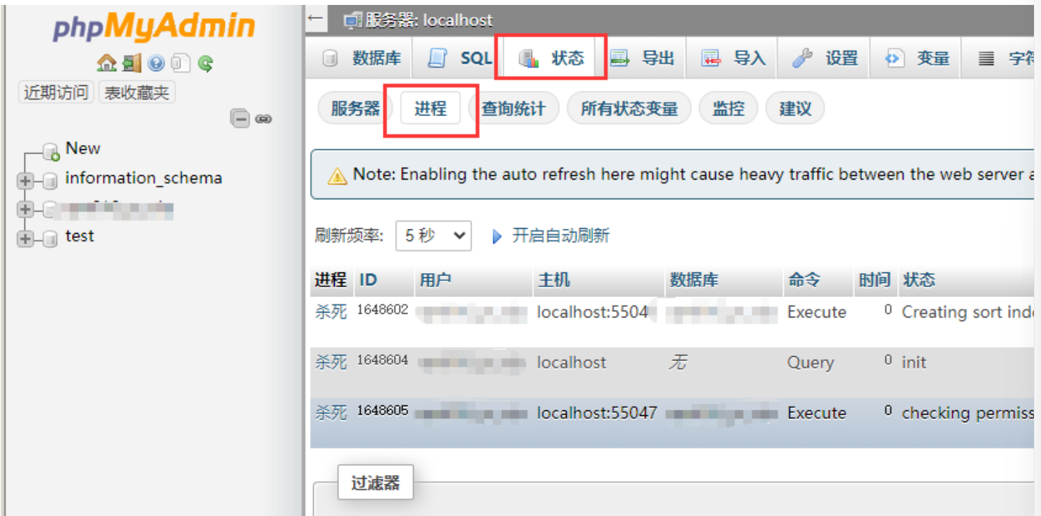 phpmyadmin也可以查看当前执行的语句连接,如图所示登陆以后点击“状态”-“进程”。